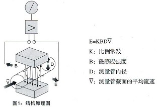 電磁流量計測量原理是基于法拉第電磁感應(yīng)定律。流量計的測量管是一內(nèi)襯絕緣材料的非導(dǎo)磁合金短管。兩只電極沿管徑方向穿通管壁固定在測量管上。其電極頭與襯里內(nèi)表面基本齊平。勵磁線圈由雙向方波脈沖勵磁時,將在與測量管軸線垂直的方向上產(chǎn)生一磁通量密度為B的工作磁場。此時,如果具有一定電導(dǎo)率的流體流經(jīng)測量管,將切割磁力線感應(yīng)出電動勢E。電動勢E正比于磁通量密度B、測量管內(nèi)徑d與平均流速V的乘積,電動勢E(流量信號)由電極檢出并通過電纜送至轉(zhuǎn)換器。轉(zhuǎn)換器將流量信號放大處理后,可顯示流體流量,并能輸出脈沖,摸擬電流等信號,用于流量的控制和調(diào)節(jié)。