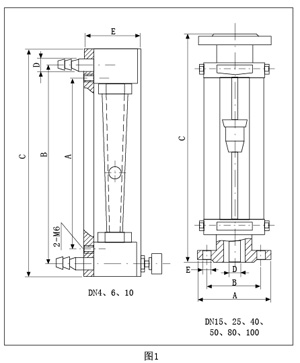ZH-LZB/LZB-( )F流量計的錐管為光滑內壁管(見圖4),通徑DN15以上的流量計,浮子通過導桿 上下移動,保持穩定;ZH-LZJ/LZJ-( )F流量計錐管 內壁有三條導向凸筋,使浮子保持穩定(見圖4)。通徑DN10以下的流量計采用軟管連接,配有針形流量調節閥;通徑DN15以上流量計采用法蘭連接。