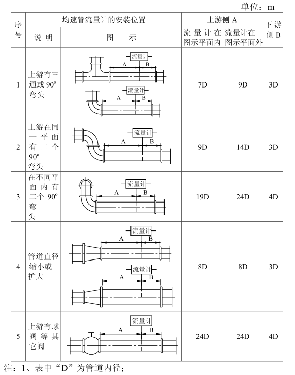 阿牛巴(均速管)流量計安裝對上、下游側必要的直管段長度要求說明:
