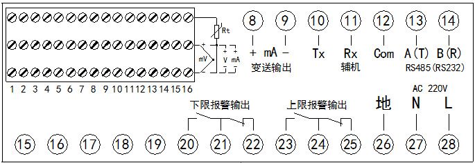 報警輸出:(1)1-64通道統一上下限報警,繼電器輸出觸點容量 AC220V/3A