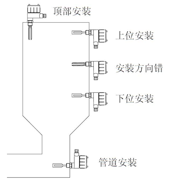 4、安裝在卸料斗內(nèi):料位開關螺牙底端與桶壁之間的最大距離不超過60mm,可避免因物料的不當堆積而發(fā)生誤報警的情況。